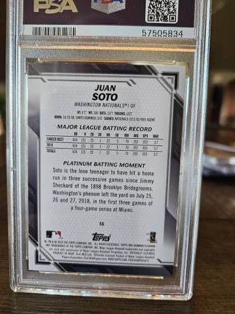 2019 Bowman Platinum card of Juan Soto, now with the NY Yankees, graded gem Mint 10 by PSA grading company. Authenticity code 57505834. Cash only; local pick up.