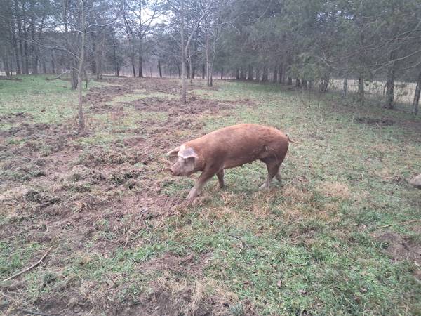 Hereford Breeding trio. I have 1 boar who is about 4 years old, one sow who is 2 and a gilt ( this will be her first litter). Sow is a good mom. We just put this boar in with these two ladies so the piglets should be coming in beautiful spring weather making farrowing a breeze. By the middle of Febuary both the sow and the gilt should be bred. The meat that comes from this breed is well marbled. This breed is also known for its wonderful growth rates being ready to butcher at the 6-9 month age. Delivery may be an option for fee depending on location